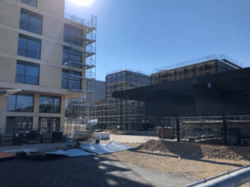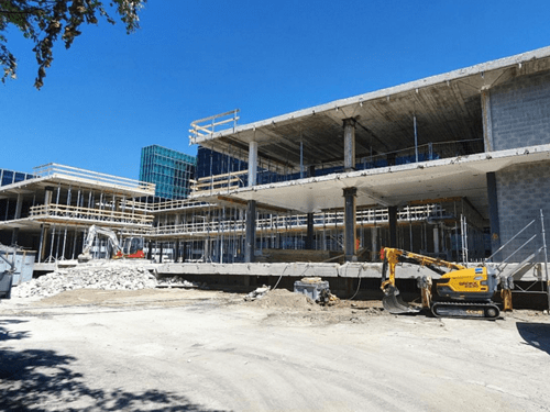 New construction of a mixed-use building divided into 2 floors of commercial space and a student housing building.